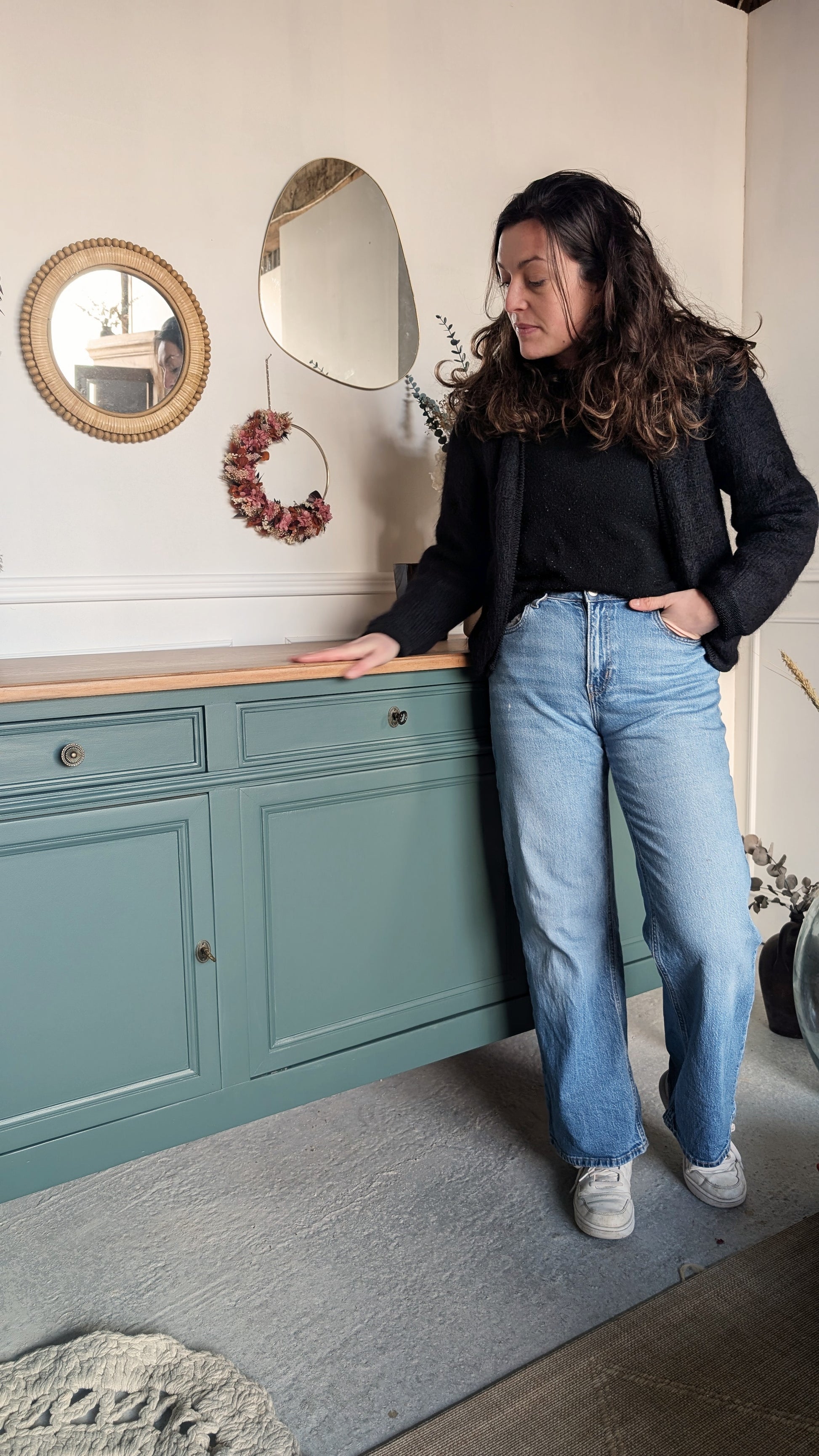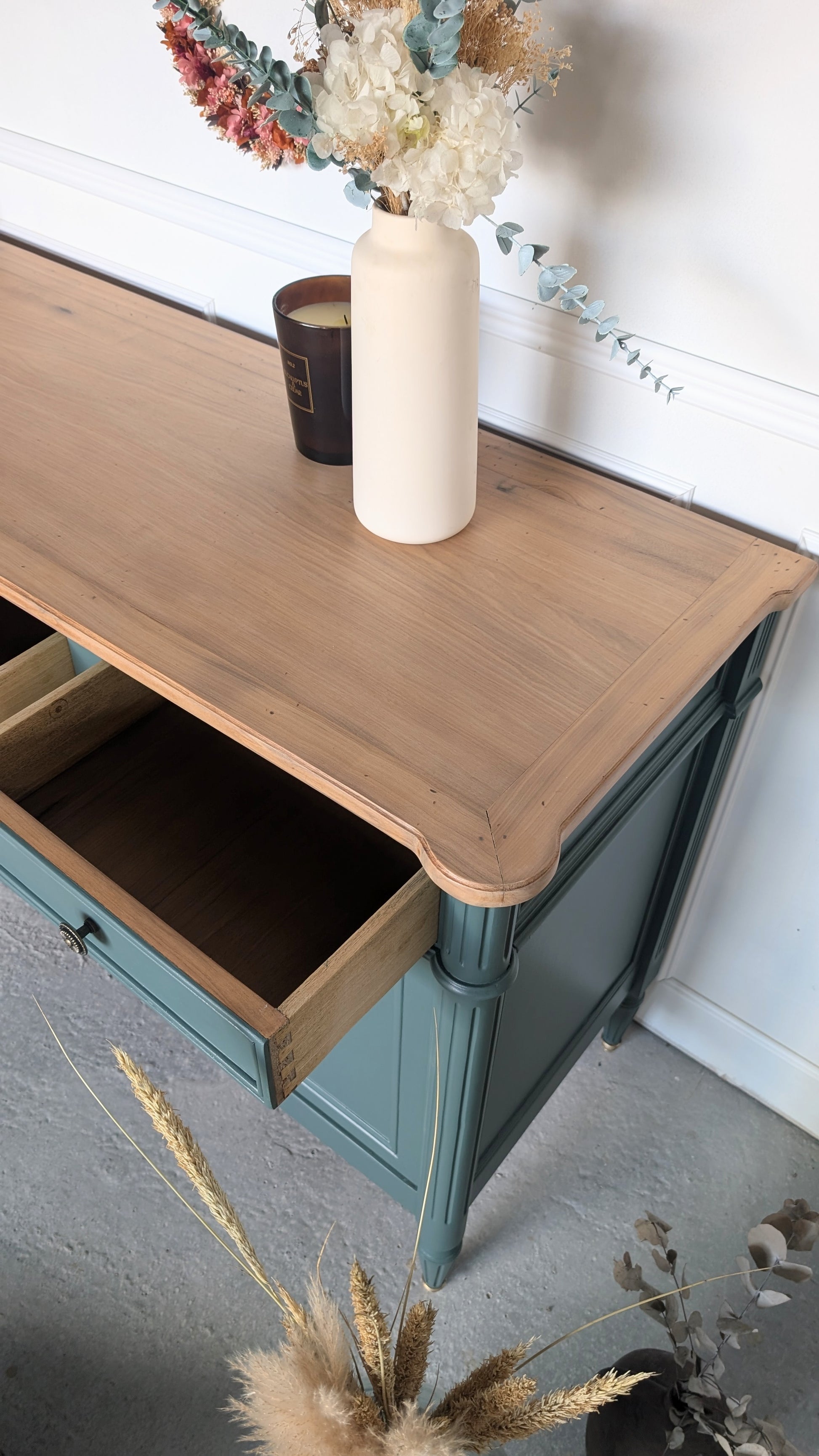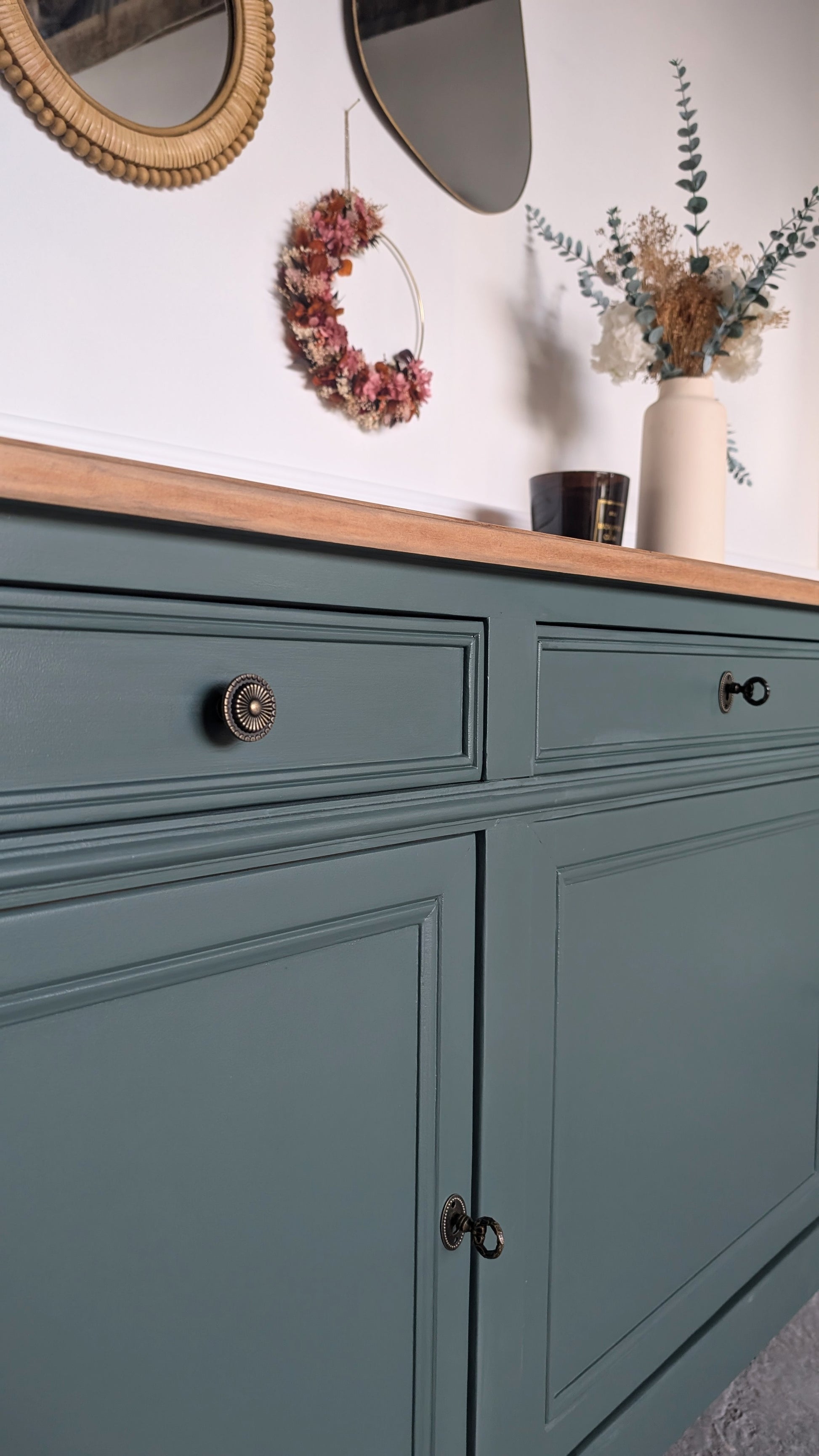 A l’atelier, le meuble a été nettoyé, poncé, puis restauré. Application d’une sous couche, 3 couches de peinture + 1 couches de vernis de finition Réf peinture; vert komorebi BLIME Boutons neufs tout comme les entrées de serrures Clefs et serrures d’origine Intérieur a été ciré tout comme les tiroirs