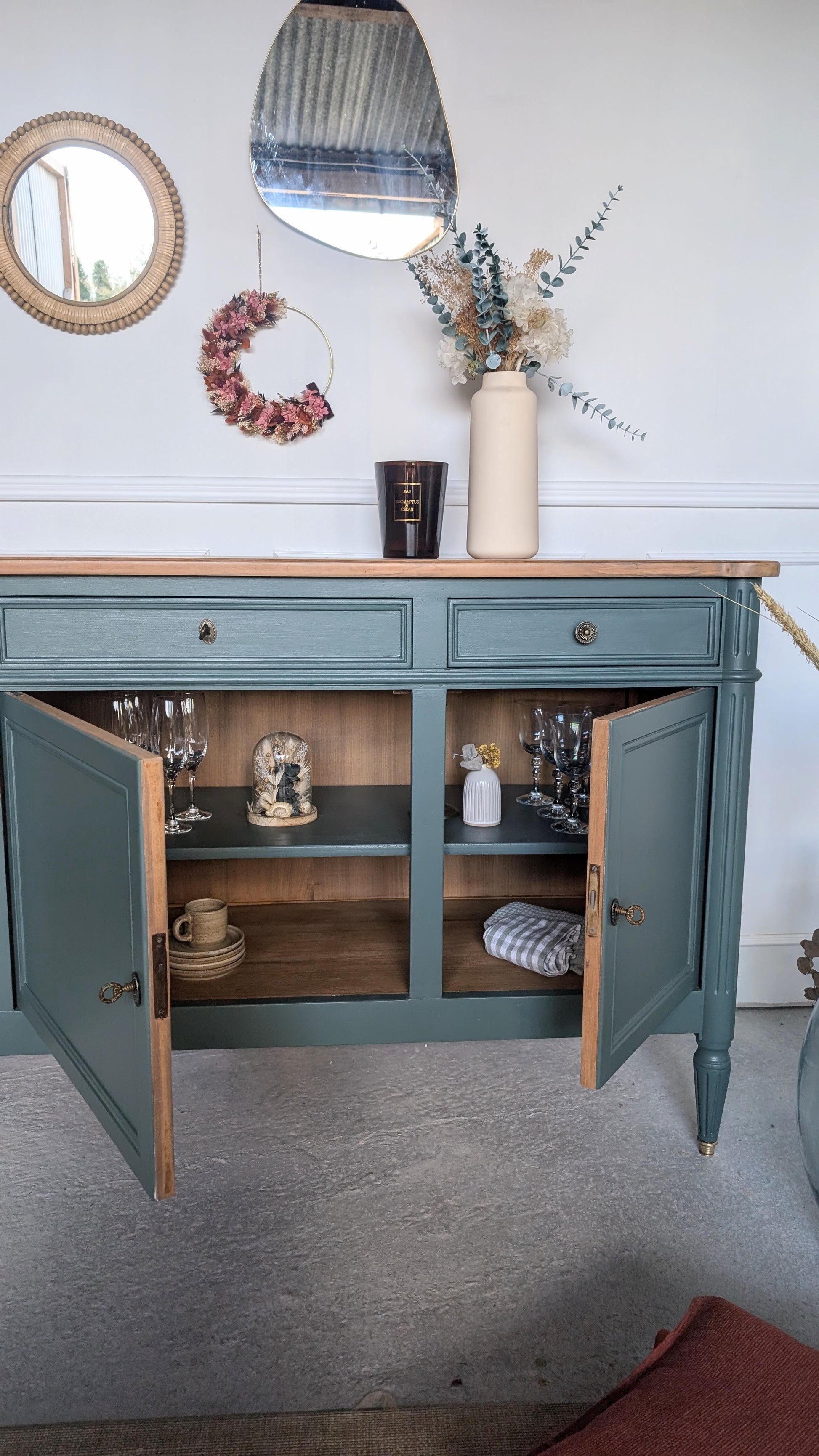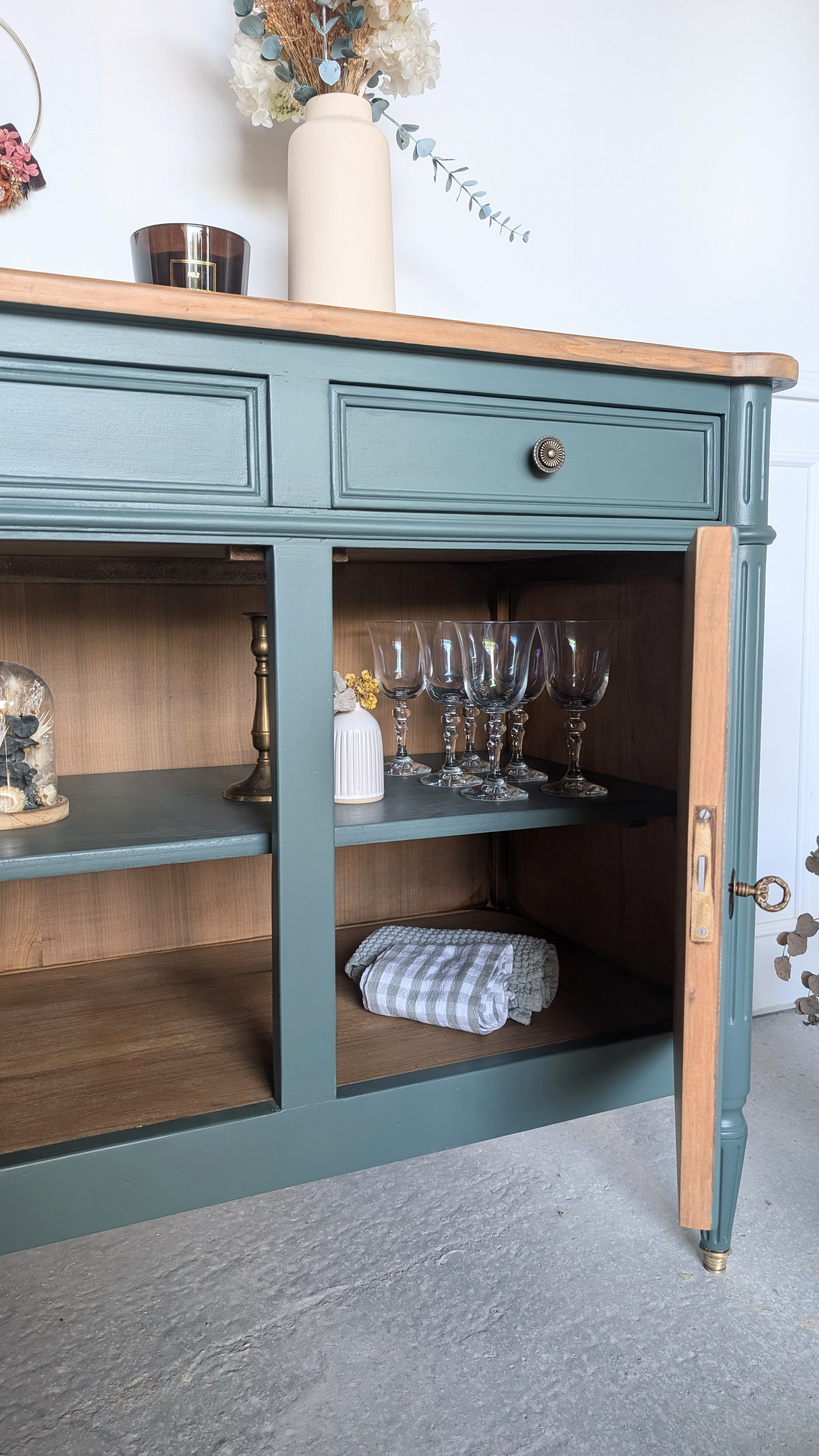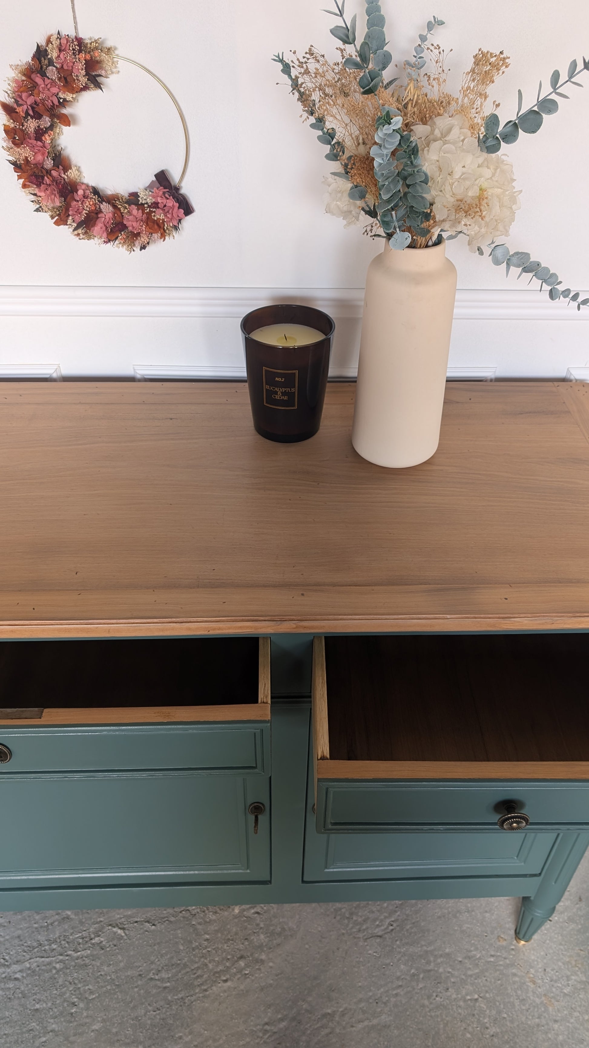 Quoi de mieux qu'une belle enfilade verte pour donner de l'élégance et de la couleur à son intérieur. De style Louis XVI, ses pieds lui donnent toute la légèreté que l'on peut rechercher pour un buffet.