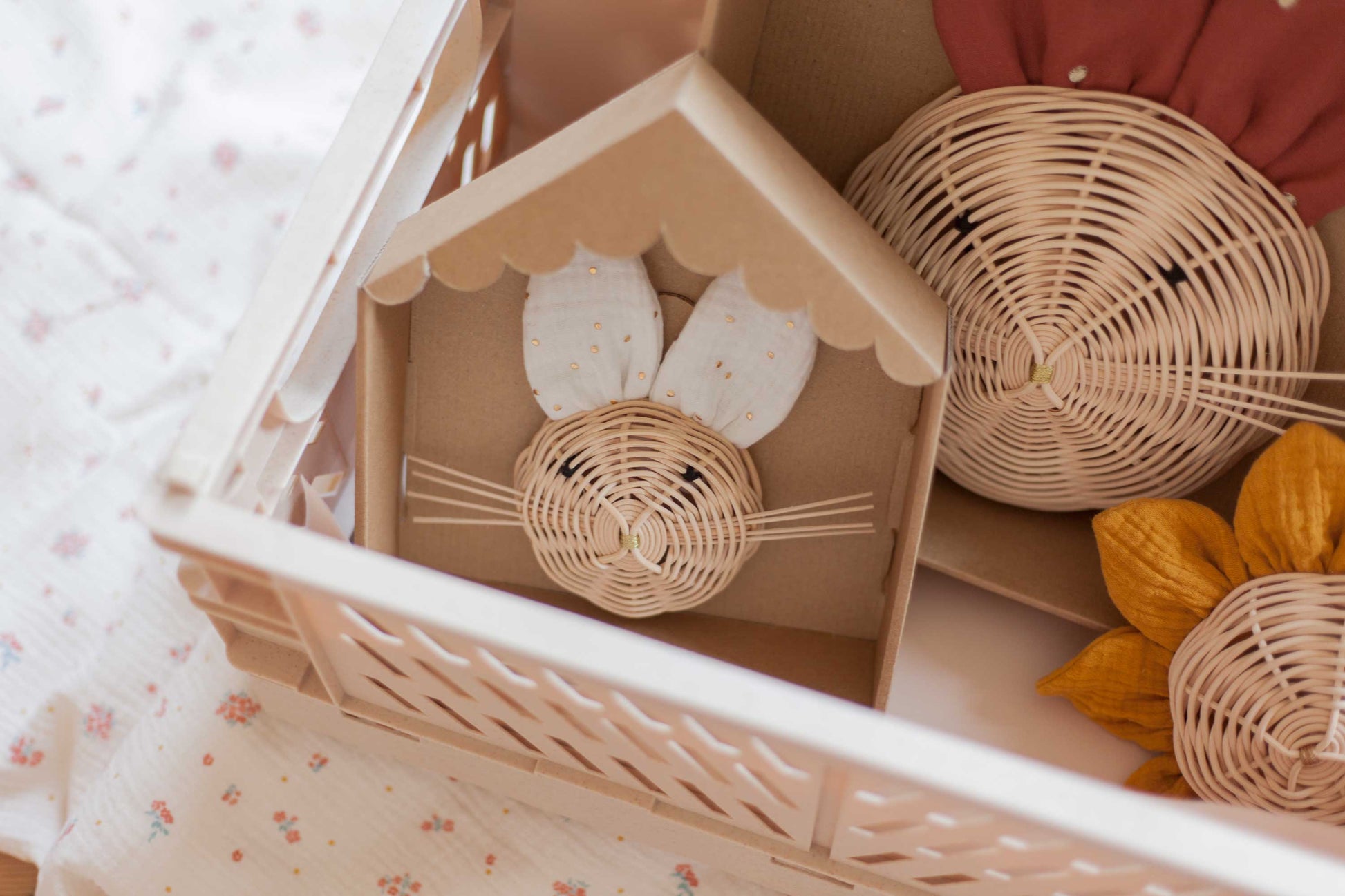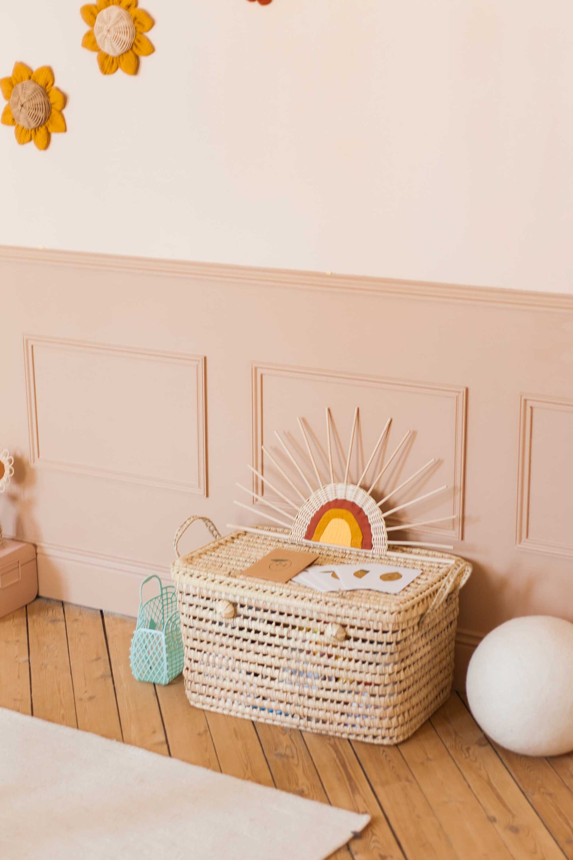 Ces fleurs en rotin et gaze de coton avec leurs pétales tout en rondeur, sont à disposer sur vos murs en solo ou à plusieurs pour venir souligner une tête de lit, un miroir ou une étagère. Vous retrouvez ces capucines dans une taille plus petite. Elles s'associent très bien avec les trophées souris et les miroirs.