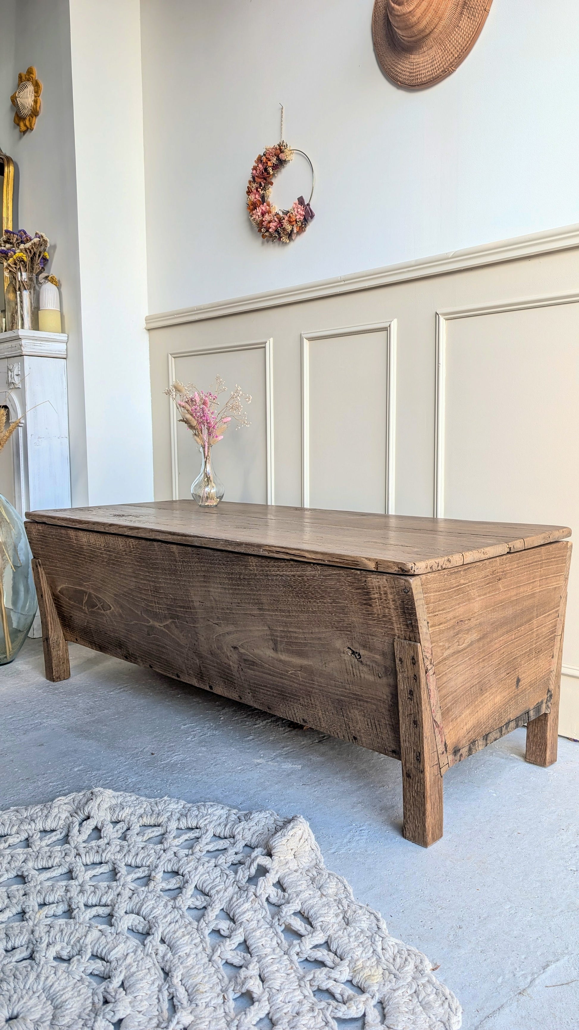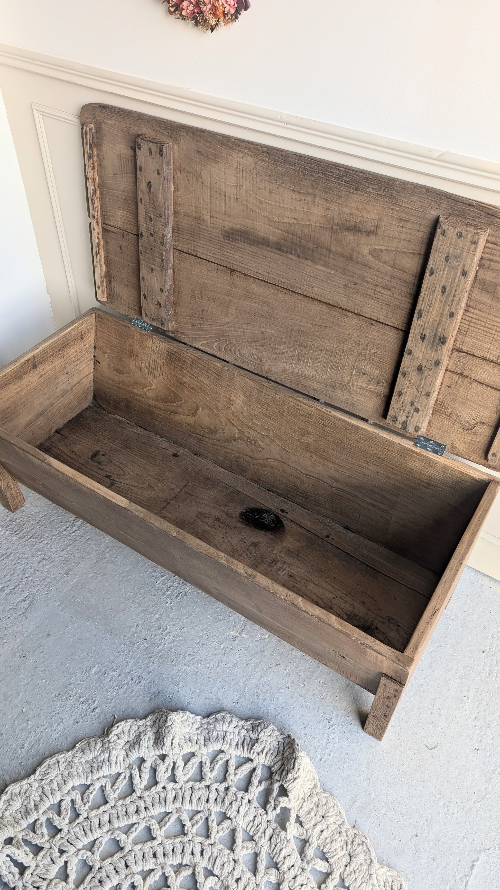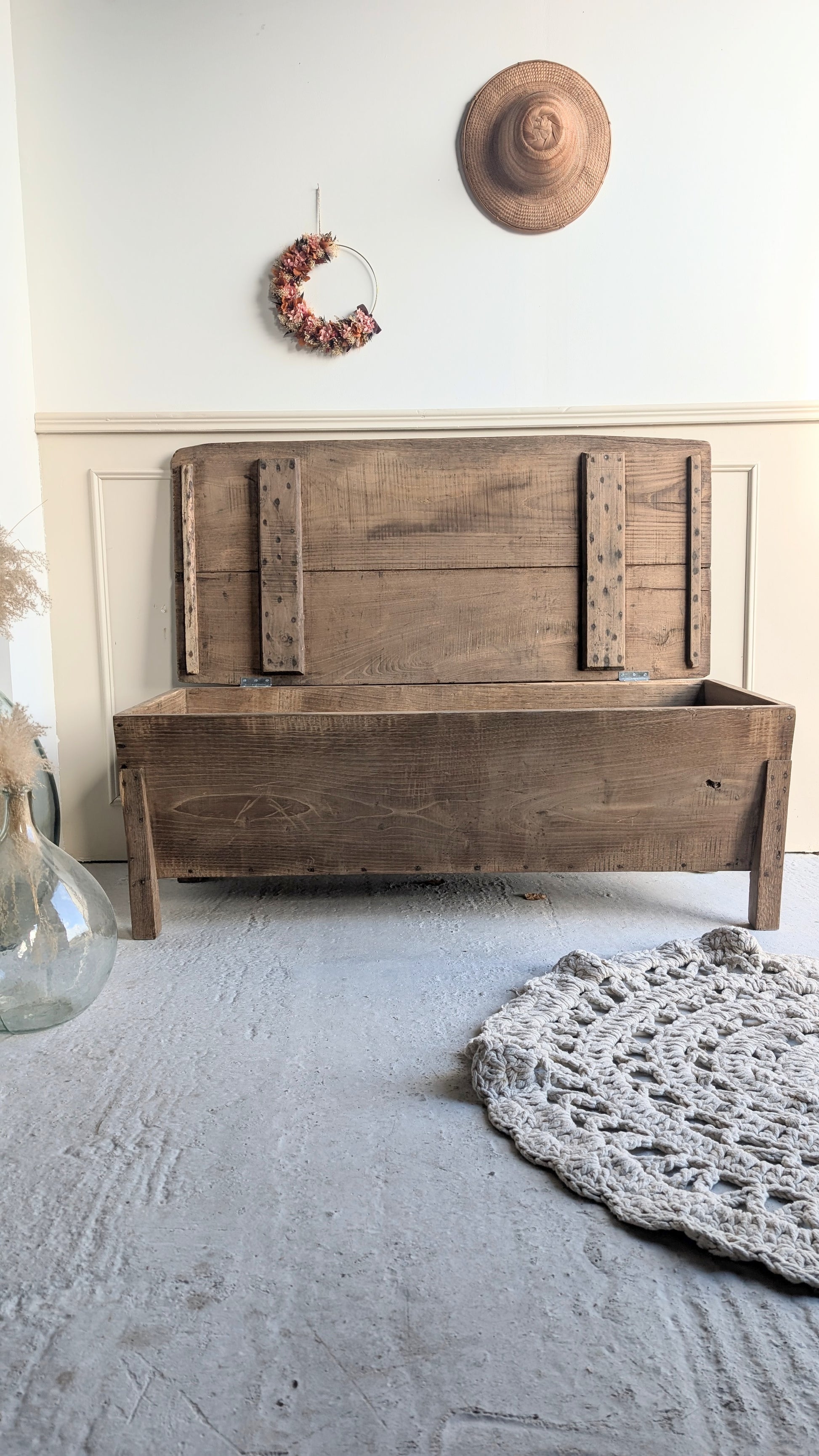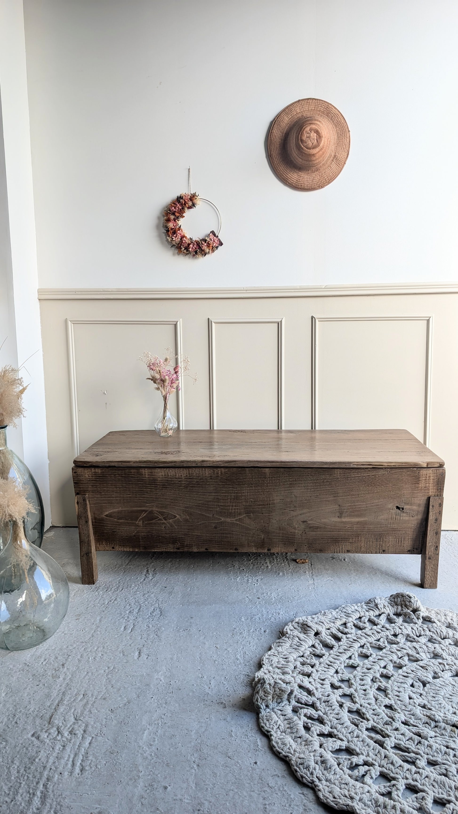 Pièce unique et pleine de caractère, cette maie ancienne a été entièrement restaurée à l’atelier : nettoyée, poncée, traitée et protégée, avec des charnières neuves pour plus de praticité.
